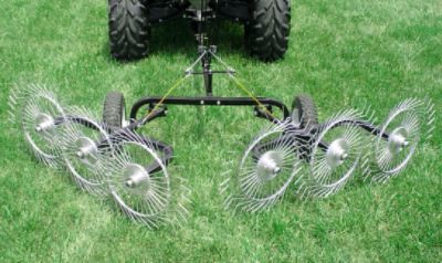 With no fuel needed, this lawn raker has wheels that power themselves when they make contact with the ground, needing only your ATV to pull the rake over the area you want cleared.
